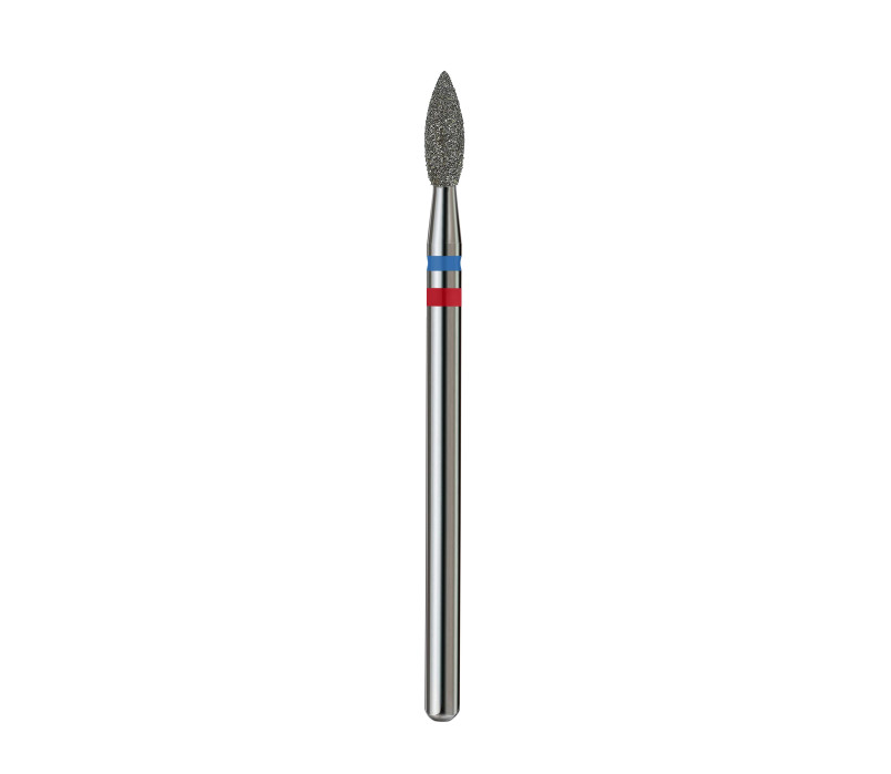 The drill bit with combined abrasiveness (blue + red) is designed for cuticle treatment, sidewalls, the undercuticle area, and skin around the nails. The combination of blue and red abrasiveness allows effective work on both delicate and more rigid skin areas.