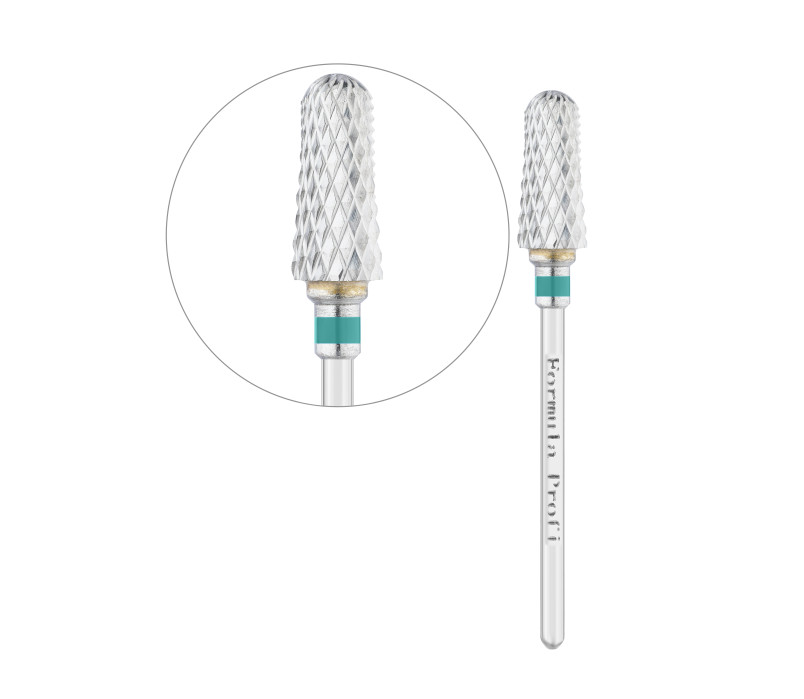 Твердосплавная фреза "Конус полусферический" с зеленой насечкой от Formula Profi—это профессиональный инструмент для быстрой и качественной обработки ногтей в маникюре и педикюре.